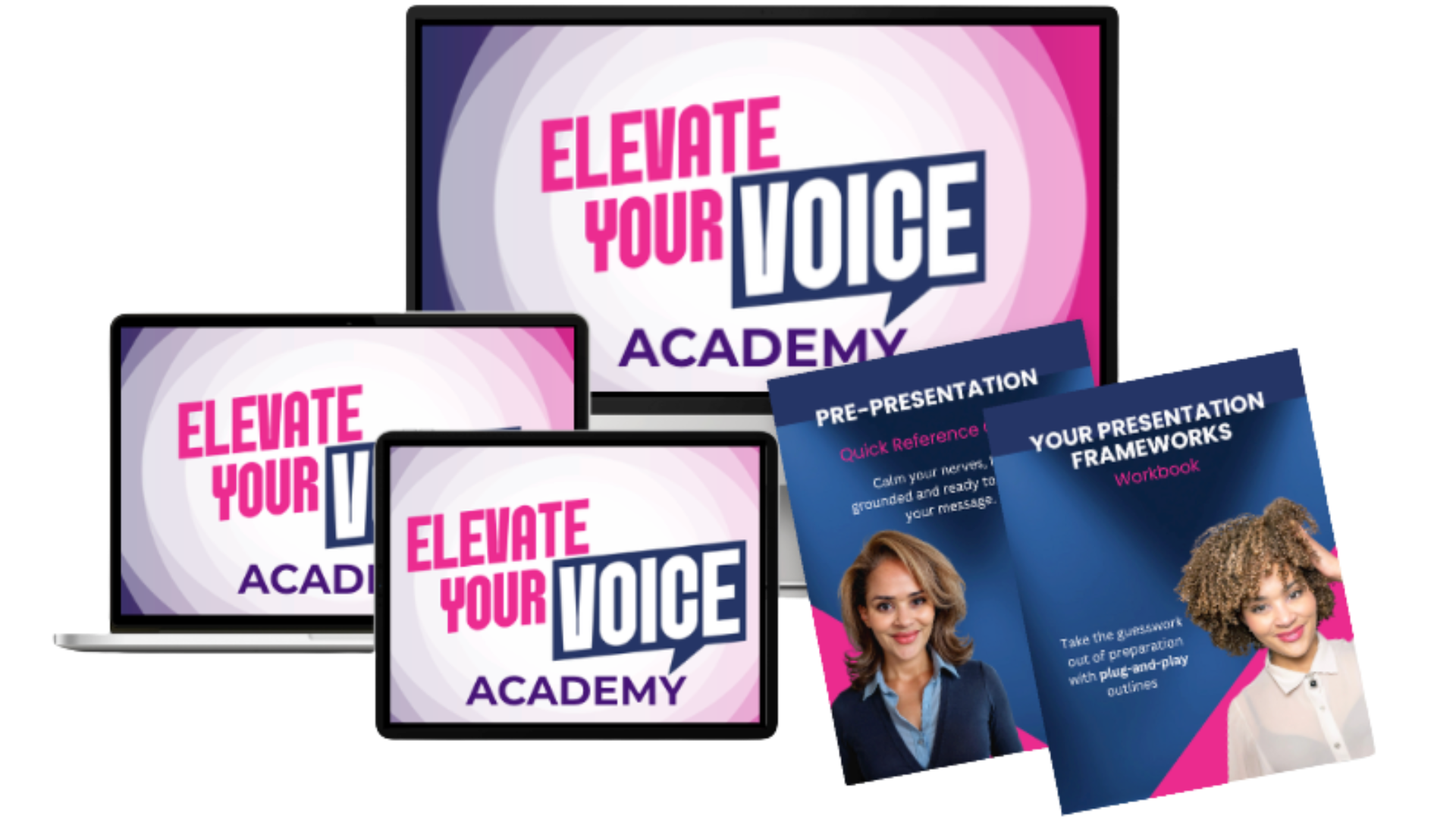 Whether it’s your next team meeting or your biggest boardroom presentation, the Elevate Your Voice Academy gives you the system and support to: